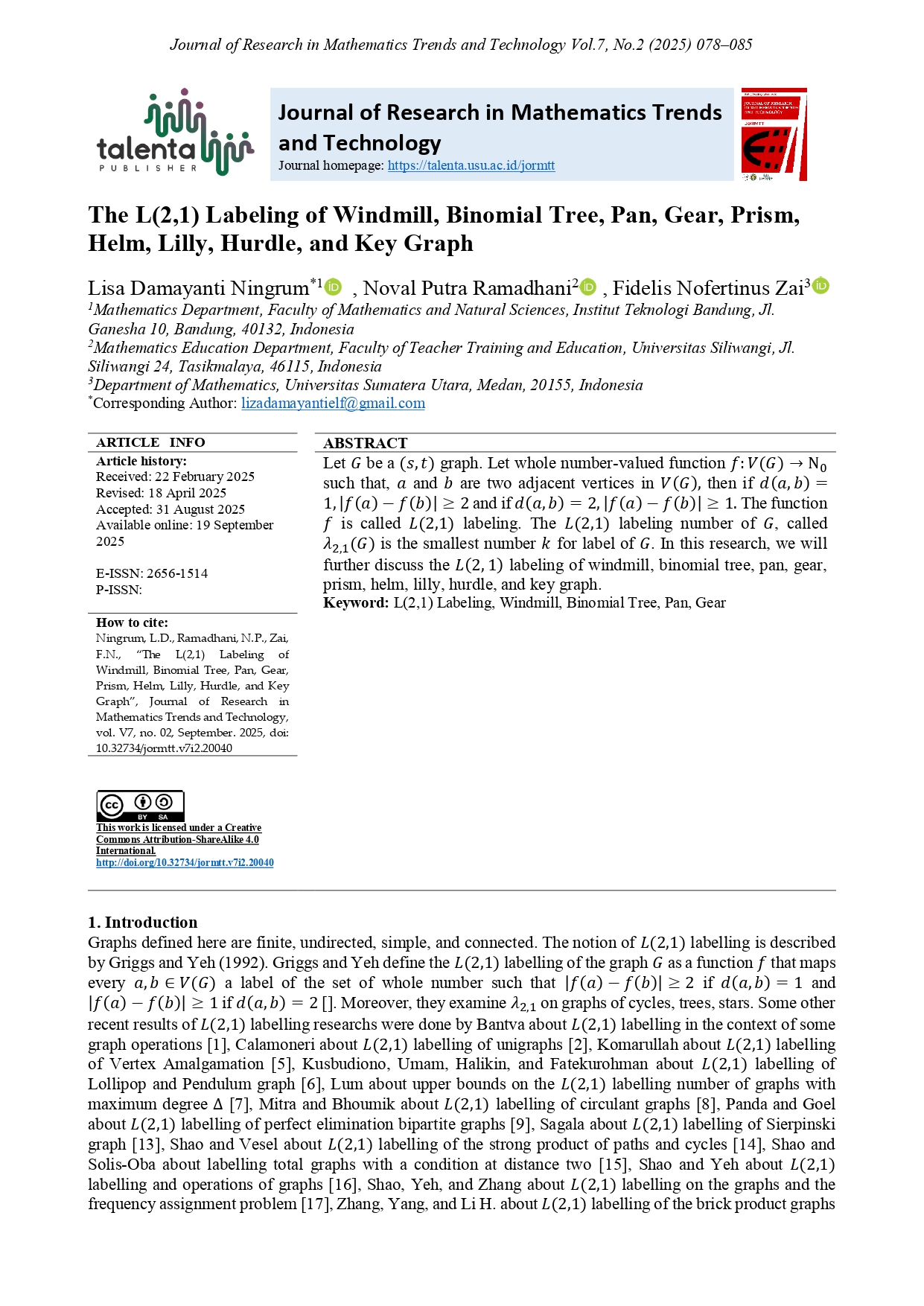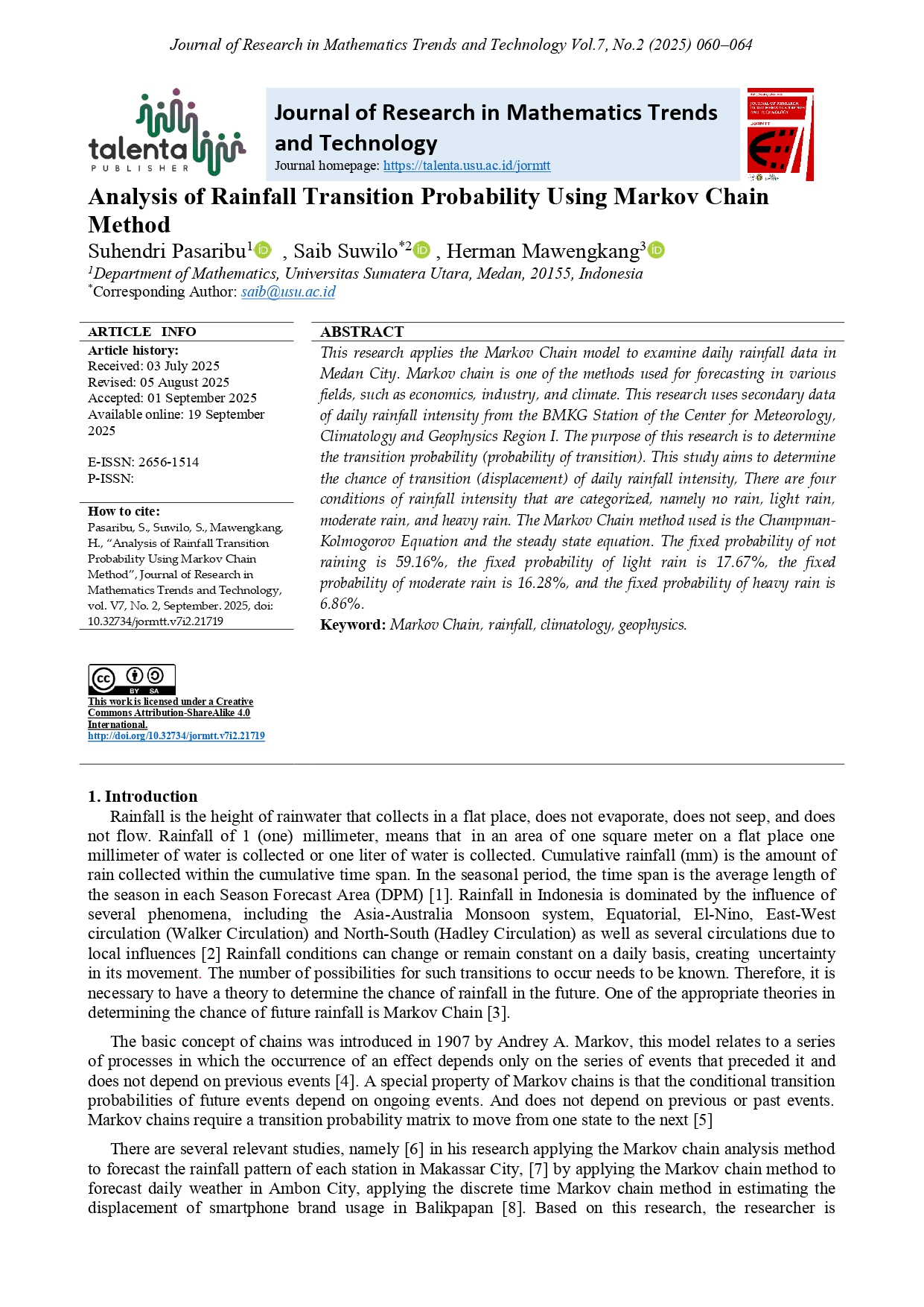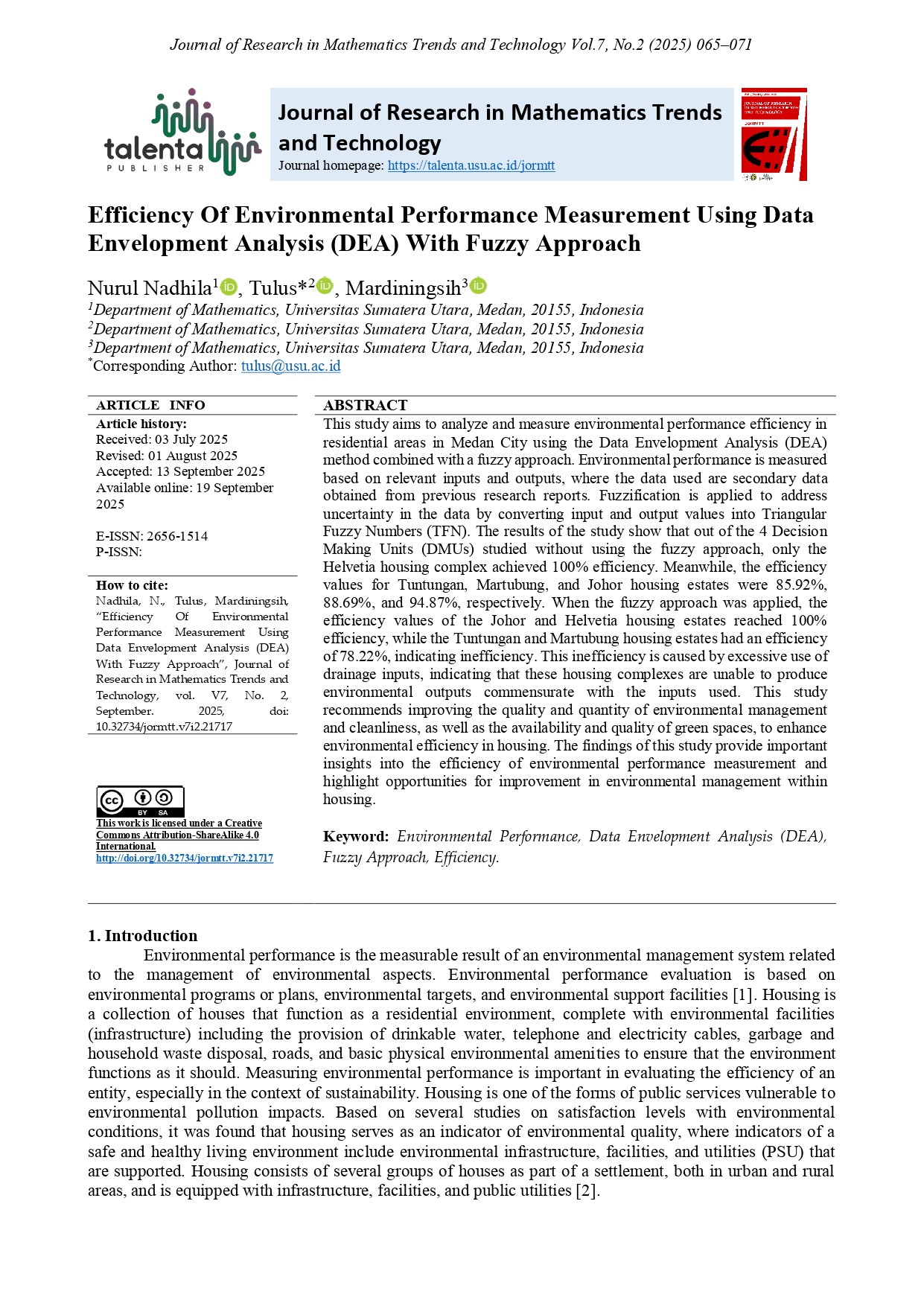 TALENTA Publisher will publish every paper under the management of the Department of Mathematics, Faculty of Mathematics and Natural Sciences, Universitas Sumatera Utara. The frequency of the publishing is twice a year, which is in March and September.
